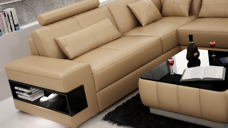 Este gran sofá de cuero en forma de L está hecho de cuero de vaca de grado superior, que tiene un toque delicado y suave. Se combina con un diseño de línea minimalista y suave, elimina las decoraciones innecesarias y mejora el estilo del espacio con una textura discreta.