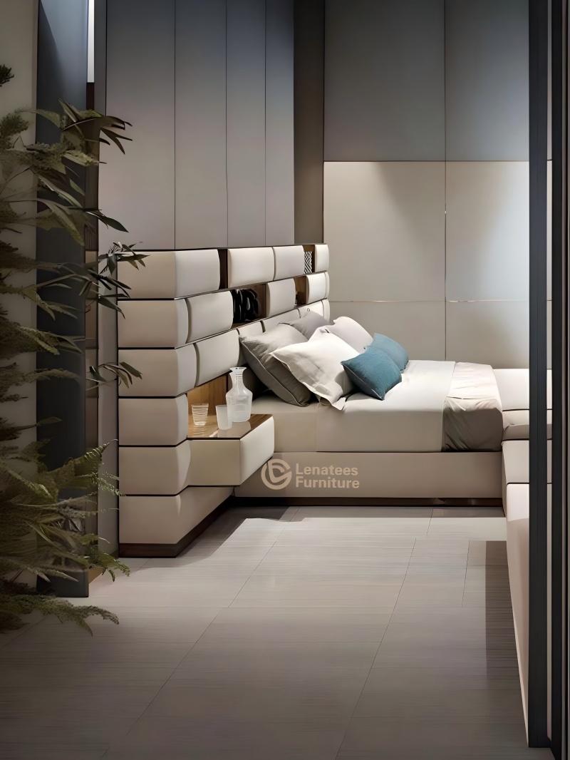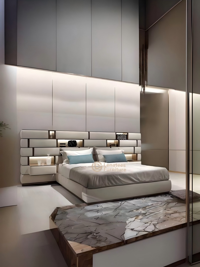 El hardware seleccionado 304 de acero inoxidable chapado en cromo se combina con bolsas suaves importadas de cuero de vaca de grano superior/terciopelo para crear un protagonista de dormitorio que combina la textura industrial con una experiencia cómoda.