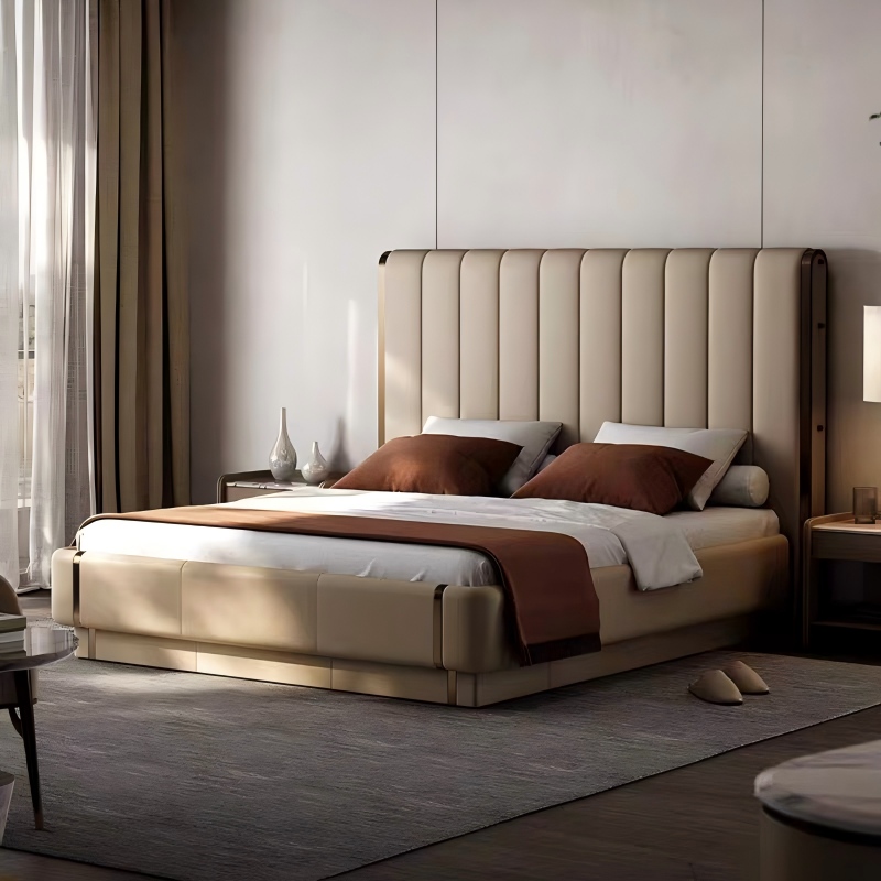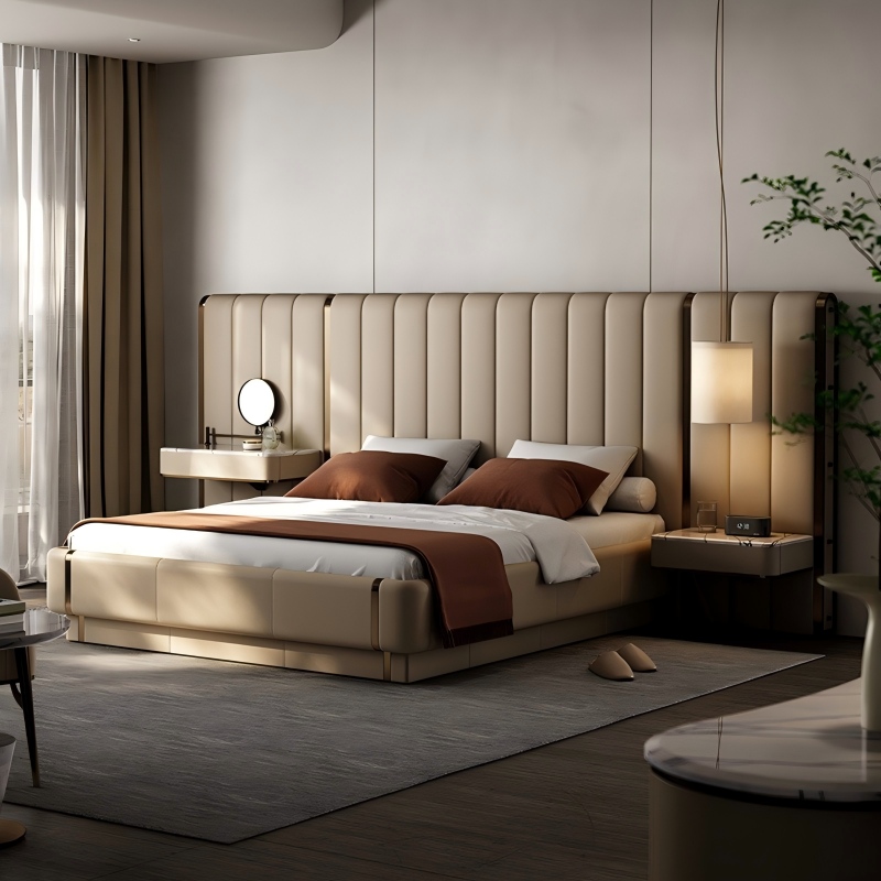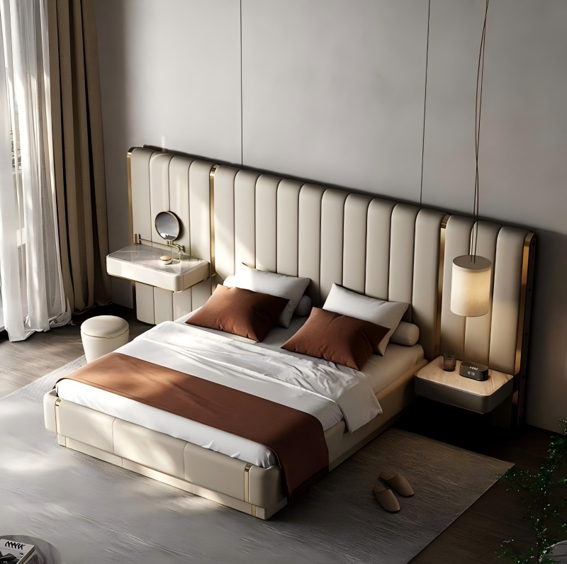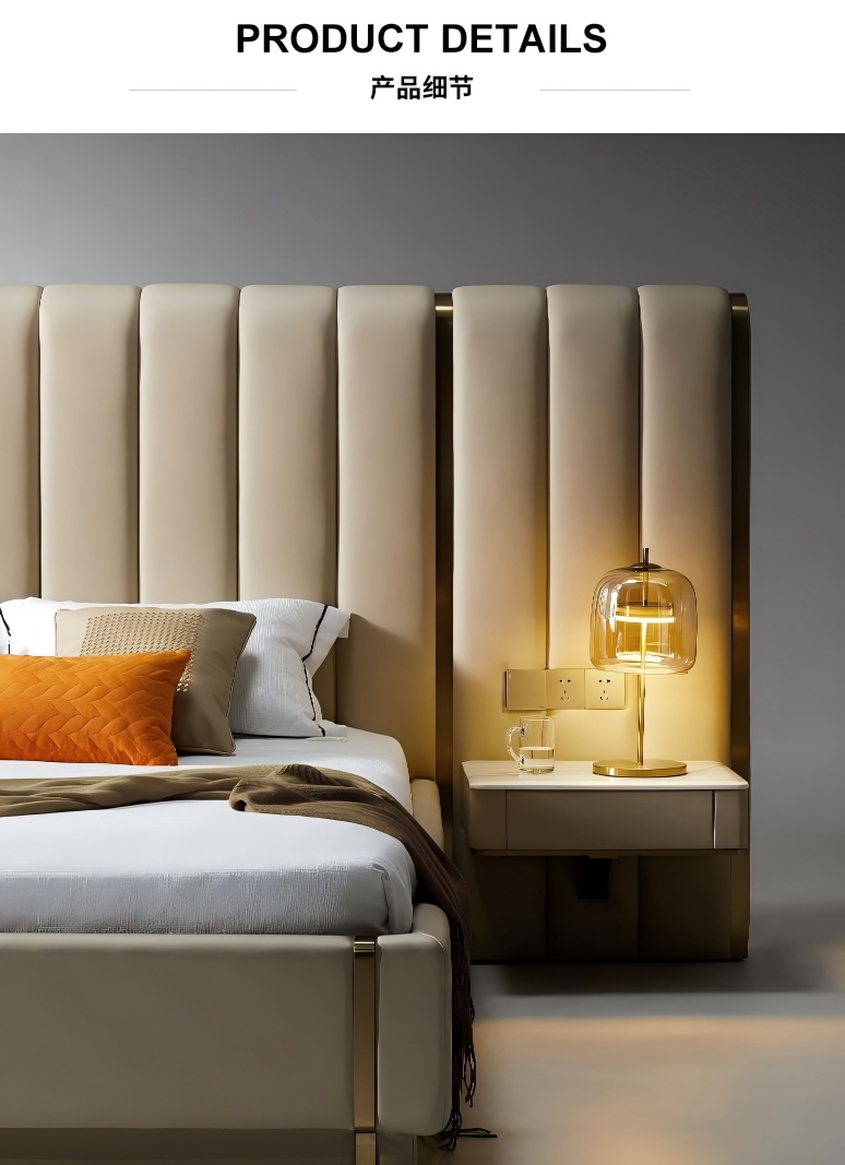 Light Luxury Master Dormitorio principal Juego de tres piezas "Cama de cuero de 1.8m + mesas de cama dobles | Casa de la capa superior, diseño flotante