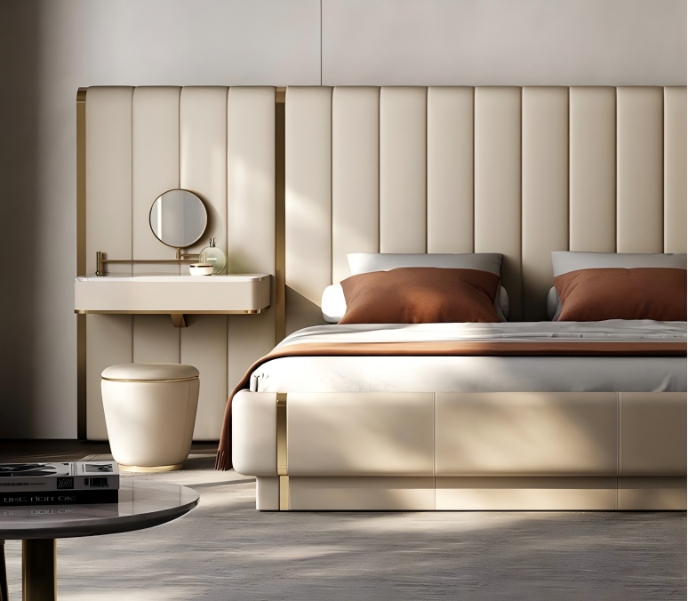 [Estilo de celebridades] cama de cuero minimalista italiano + mesa de noche de tablas de roca | juego de dormitorio
